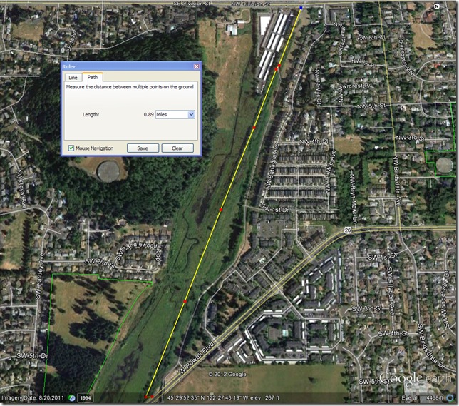 The trail follows portions of the the right-of-way of the old Troutdale Branch north to where the ROW crossed what is now NE Halsey Street in Fairview.